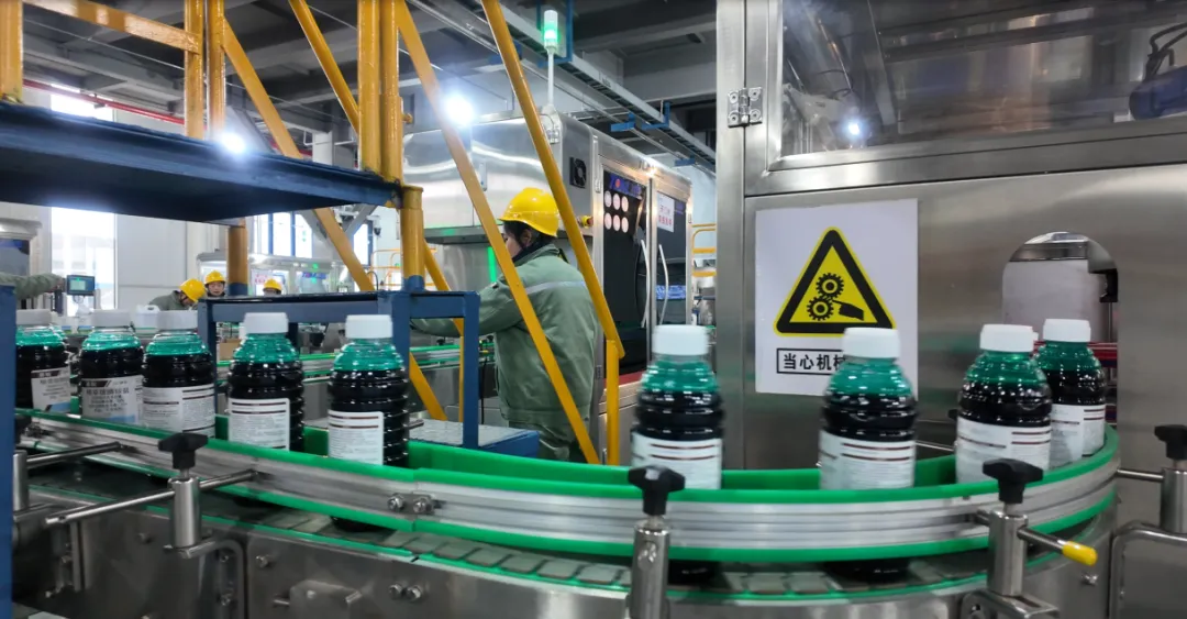 ▲湖南利尔生物科技有限公司,精草铵膦制剂产品源源不断下线。(刘蓉/摄)