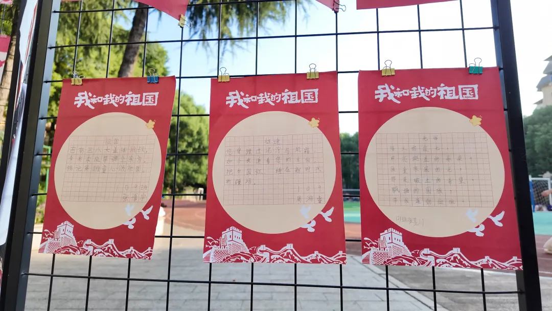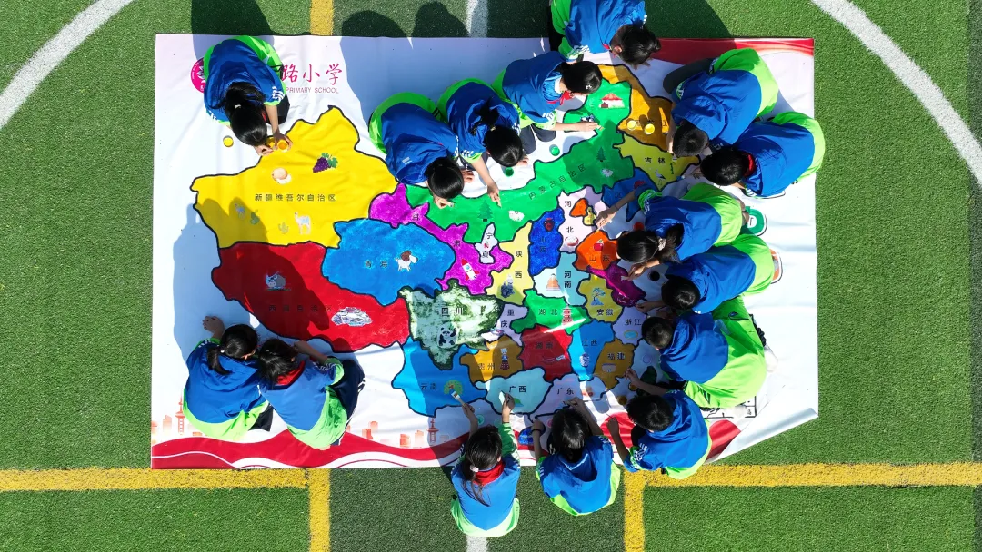 在操场上,孩子们用笔刷共同绘制巨幅地图,用彩笔勾勒山河、描绘团结,并在每个省份的版图上标注美食、景点、动物等地方特色文化,增加趣味性。来自学校跳绳队和啦啦队的孩子们则摆出数字76和五角星的字样,共同唱响《歌唱祖国》,大家以团结协作、勇于拼搏的体育精神,表达对祖国最深情的礼赞。此外,全校师生还以“红色经典诵读”和“书写三行诗”的方式,表达对祖国母亲的爱。活动不仅深化了学生对国防安全与民族团结的理解,更在孩子们心中播下爱国立志的种子。