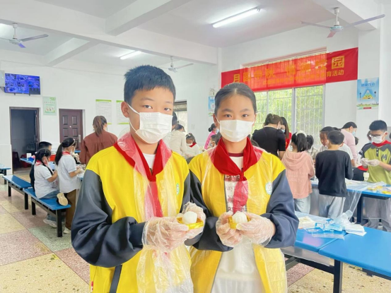 本次活动的核心环节“巧手做月饼”将现场气氛推向了高潮。学生、家长和老师们混合编组,协力合作。大家参照桌上的制作步骤,揉面、包馅、压模,忙得不亦乐乎。在体验传统美食制作过程中,留守儿童和特需学生在与同伴、师长及志愿者的互动中深切感受到了来自“校园大家庭”的温暖与陪伴。