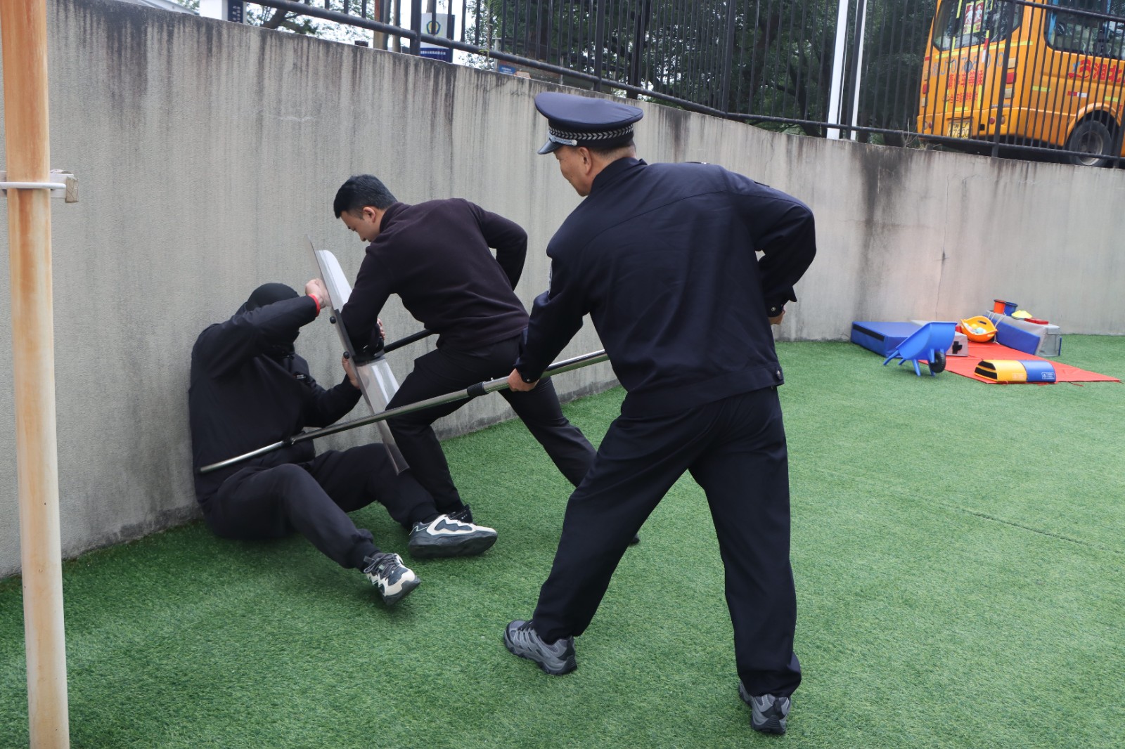 演练前,各班级教师组织幼儿通过观看警示教育片、情景表演及亲身体验等多种教育形式,开展了反恐防暴应急避险的安全教育活动。上午10点,一名“歹徒”伪装成家长,强行闯入幼儿园,安保人员立即启动一键报警系统,教师迅速组织幼儿撤离至安全区域,应急小组利用防暴器械与“歹徒”周旋。最后多方协作成功制服“歹徒”,解除警报。整个演练过程紧张有序,师幼反应迅速、配合默契,达到了预期效果。