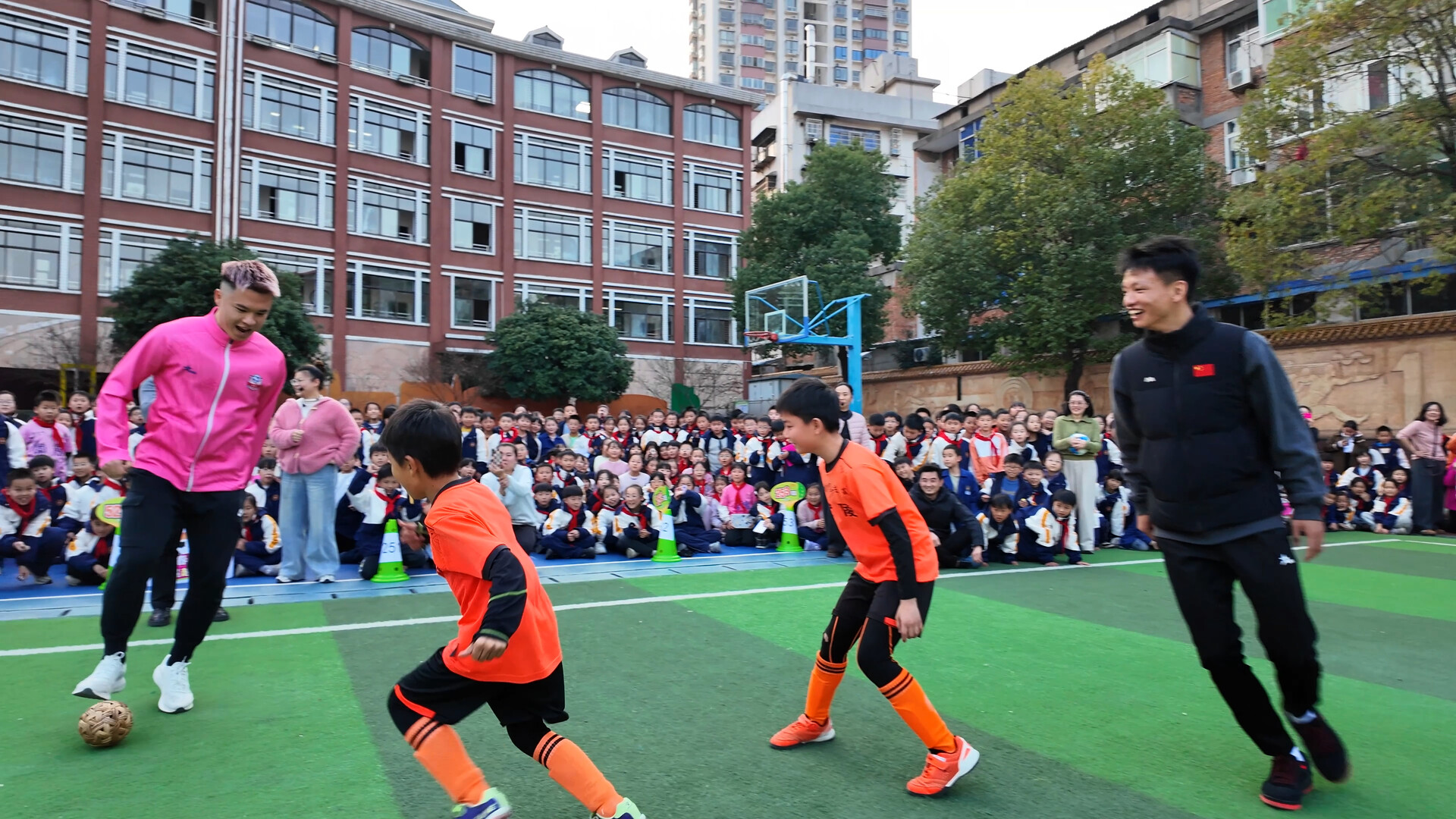 为迎接球员到来,各小学还组织了啦啦操、舞狮等表演。在武陵区北正街恒大华府小学的见面会上,学生们踊跃提问,队员们则耐心分享训练技巧与成长故事,鼓励孩子们从足球中学会团结、坚持与拼搏。