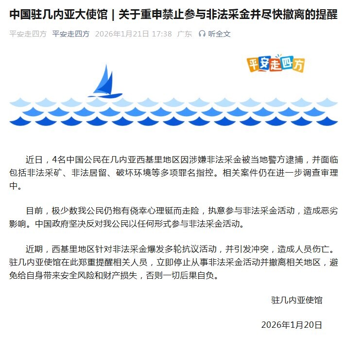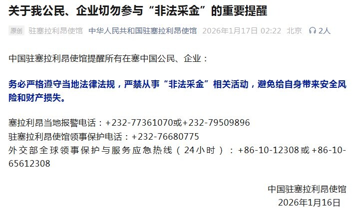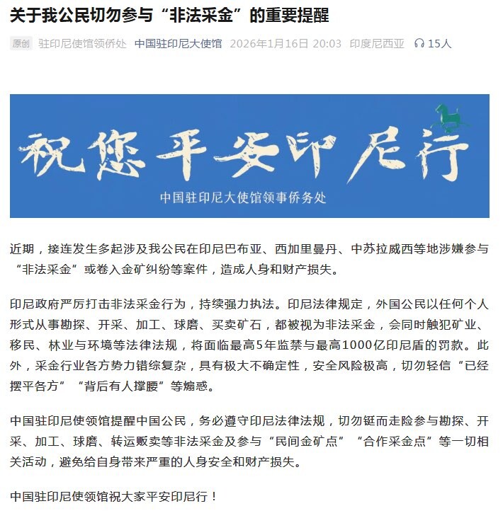 驻外使馆的提醒:中国驻印尼、加纳、刚果(金)等国的使馆多次发布提醒,强调非法采金的高风险,要求公民立即停止此类活动并撤离。例如,中国驻印尼使馆2026年1月提醒,切勿参与“非法采金”,否则将面临法律制裁;中国驻刚果(金)使馆2025年10月提醒,不得在刚东四省(安全极高风险地区)采矿。