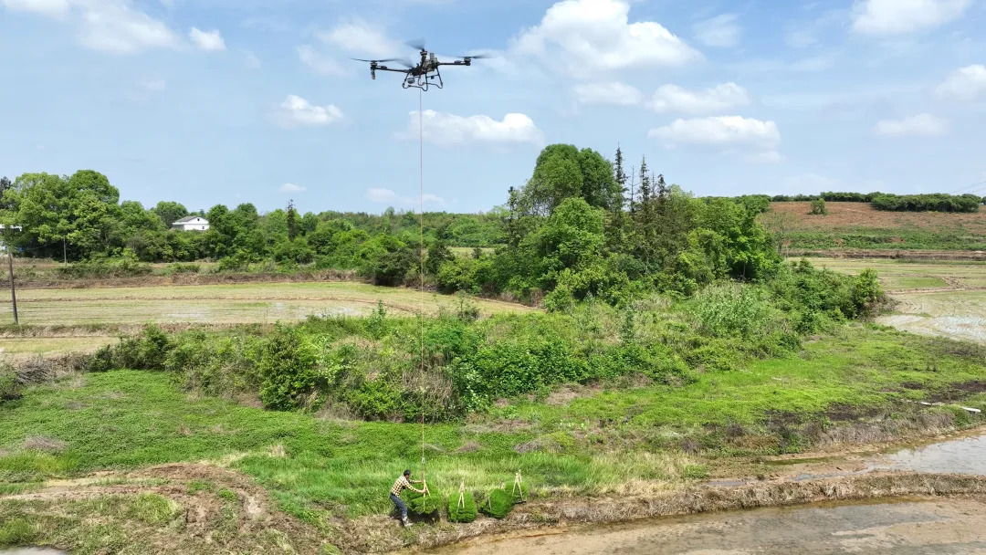 在常德武陵区石门桥镇,种粮大户戴长铭的2000多亩稻田进入插秧关键期。过去靠人工搬运秧苗,又累又慢;今年他请来了新帮手——无人机。只见一架农用无人机吊起80多公斤秧苗稳稳升空,飞跃村舍和公路,不到一分钟就将秧苗精准送达一公里外的田块,一天下来无人机可以运送150余趟。