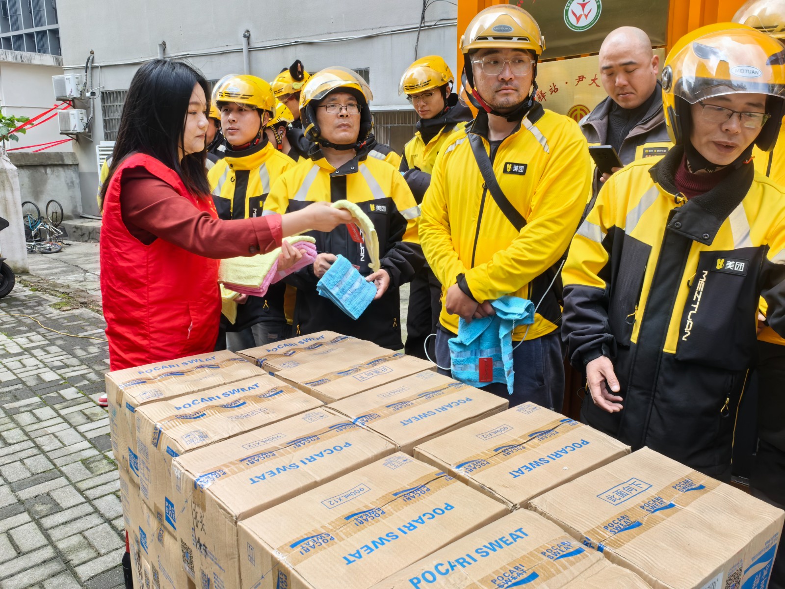 社区工作人员为每位骑手送上一箱功能性饮料,叮嘱大家在跑单途中注意交通安全、劳逸结合,及时补充能量,谨防因忙碌奔波引发低血糖等身体不适。一句句贴心提醒,一份份爱心物资,传递着社区对“城市摆渡人”的敬意与关爱。